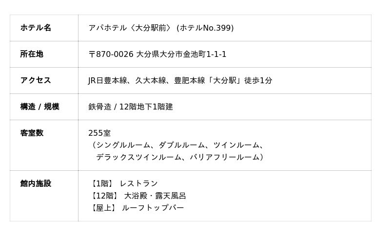 アパホテル〈大分駅前〉HP:https://www.apahotel.com/hotel/kyushu-okinawa/oita/oitaekimae/