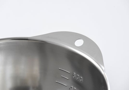 一般的なボウルの注ぎ口は1段階の突き出しが多いですが、当製品はキレの良さにこだわり、突き出しを2段階に折り曲げた独自形状を採用。液体が注ぎ終わったあとに自然とボウル内へ戻りやすく、注ぎ口に液が残りにくいため、液だれを防止。特に玉子焼きやたこ焼きなど、液体を複数回注ぎ入れる場面でもスッと切れて、調理中のストレスを軽減します。