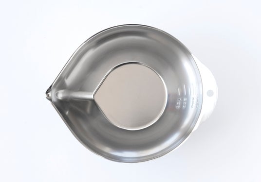 しずく型の底面は、液体を自然に注ぎ口へと集め、一気に流れ出るのを防ぎながら、スムーズに注ぐことができます。この特殊な形状は、一般的な円型のボウルとは異なり、成型時に厚みを均一に保つことが難しく、場所によっては亀裂が入り、割れてしまうことがあります。その微細な調整には、燕三条の職人ならではの経験と技術が欠かせません。