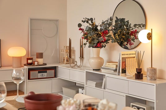 レッドベリーの枝やLEDのガーランドライトをさりげなく取り入れるだけで、クリスマスの雰囲気を手軽に引き立てることができます。 過度な装飾はカジュアルな印象を強めるため、インテリアとの調和を大切にしたい方は、一部のディスプレイにポイントとして加えてみてはいかがでしょうか。