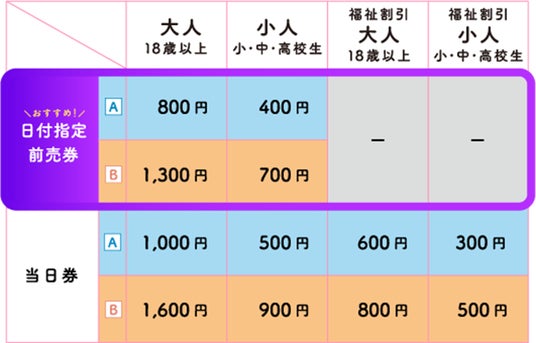 料金変動制のため、来場日により料金が異なります。詳しくは左表および公式サイトにてご確認ください。