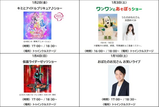 新春もお子様に大人気のキャラクターやお笑い芸人がメガイルミのステージを盛り上げます。
