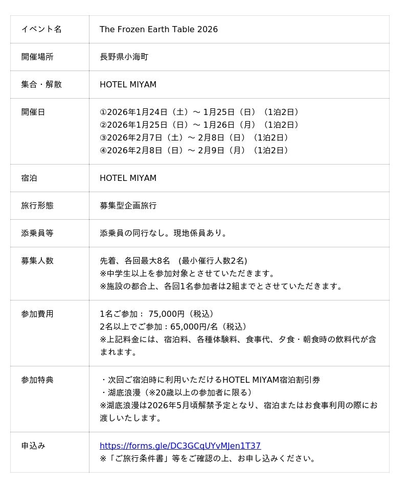 全国50エリア以上で地方創生事業のプロデュースを行う株式会社さとゆめ(本社:東京都千代田区、代表取締役:嶋田 俊平、以下「さとゆめ」)が、長野県小海町の冬の魅力観光推進事業の一環として、2026年冬に「The Frozen Earth Table」を開催いたします。本ツアーは、“凍てつく自然と共に食をあじわう” ことをテーマにした、冬の松原湖でしか実現できない氷上であじわう食体験ツアー体験です。