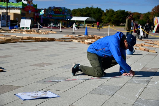 3.制作開始11月下旬になると、「大観覧車前」で、巨大なウマの姿がバランスよく描かれるように、地面を計測します。下絵を基にチョークでウマの形を手描きします。