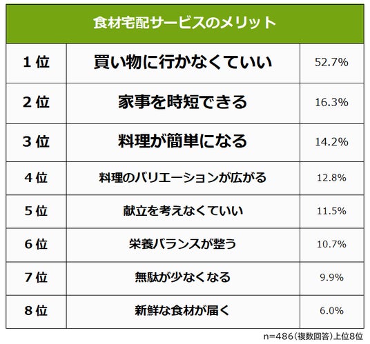 そこで今回、株式会社ビズヒッツ( https://bizhits.co.jp/ )が運営するBiz Hits医療ライティング代行サービス( https://bizhits-medicalwriting.websozai.jp/ )は、食材宅配サービスを利用したことがある486人に「食材宅配サービスのメリット・デメリット」についてアンケート調査を実施。その結果をランキング形式でまとめました。