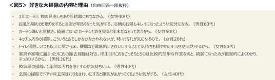 好きな掃除は「お風呂のカビ取り」や「換気扇掃除」など。嫌いな掃除は「カビや頑固な油汚れ」「お風呂・トイレ」などで、キッチン周りと水回りが多い。掃除の後はきれいにすることで気持ちが「穏やかになる」「さっぱりする」の声があがった。<図5・図6>