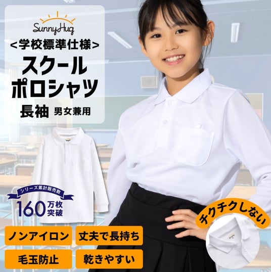 SunnyHugの半袖スクールポロシャツは、親御さんの声を元に毛玉ができにくい素材に改良しました。専門機関のピリング(毛玉)試験において高ランクの5級を取得しました!毛玉が出来づらく、長い期間でご着用頂けるよう改良したこだわりのスクールポロシャツとなっております。綿のような柔らかな肌触りと汗をかいてもサラサラ感続く吸汗速乾性を両立した特別な鹿の子生地を採用しております。お洗濯の乾きが早くしわになりにくい吸水速乾性でお洗濯をラクにする機能面にもこだわったスクールポロとなっております。