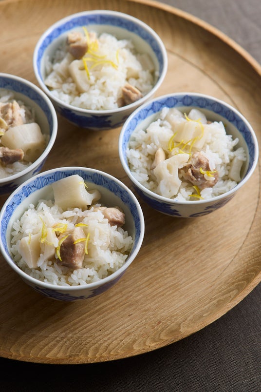▲鶏肉とれんこんの塩だし炊き込みご飯