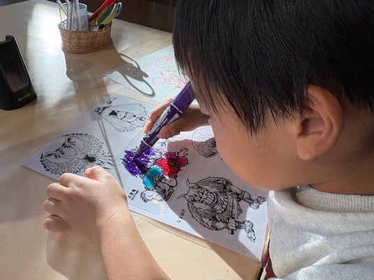 妖怪の輪郭を縁取り、好きな色を塗ります