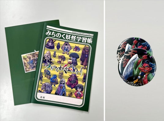 左:オリジナルノート 右:妖怪缶バッチ(全29種類)