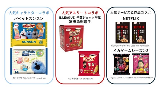 栗山米菓ではこれまでも、キャラクターやコンテンツなど、さまざまなジャンルとのコラボレーションを展開してきました。今年は、アスリートとの初コラボにも挑戦し、「B.LEAGUE 千葉ジェッツ所属・富樫勇樹選手」との取り組みをはじめ、「パペットスンスン」「Netflix」など、新規コラボも実施しました。