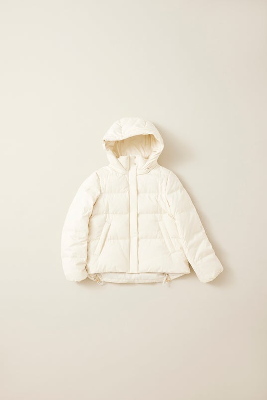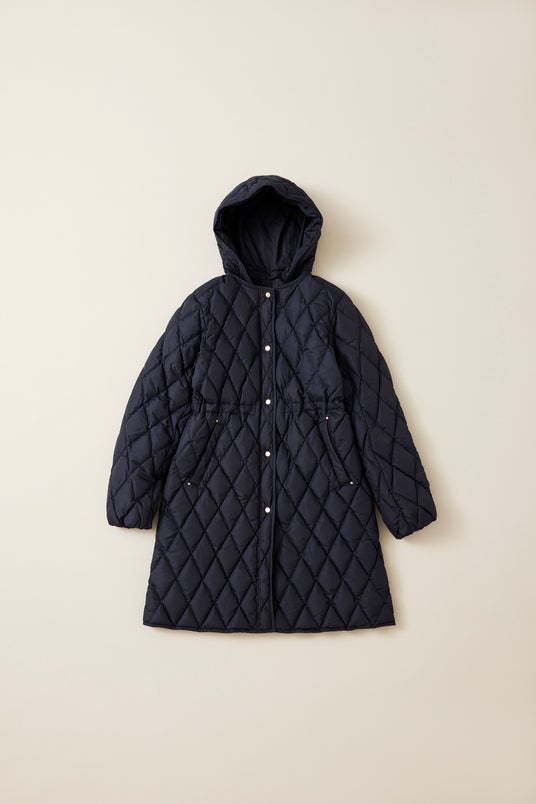 サイズ感と中わたの分量にこだわり軽やかに羽織れるキルティングダウンコートに仕上げました。きらりと光るボタンやキルト幅の大きさがデザインのポイント。フードは取り外し可能で、気分やシーンに合わせた着こなしが楽しめます。ウエスト内側にはドロストコードを備え、シルエットの調整も自在です。