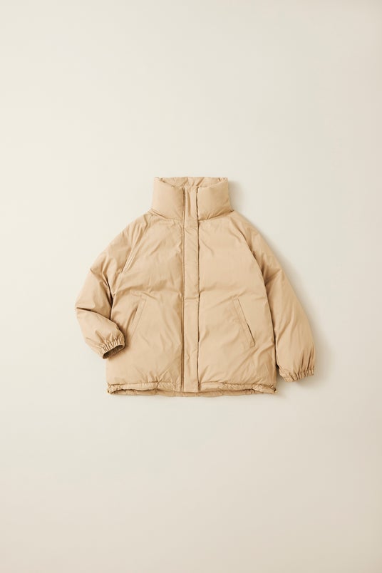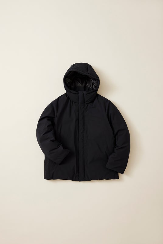 上記フード付きダウンと同シリーズのショート丈版。フードは取り外し可能、袖口はゴム仕様で風を防ぎ、裾のドロストコードでシルエットを調整することもできます。上下から開閉できるダブルジップで動きやすさとデザイン性を両立しました。こちらもオンオフどちらのシーンでも頼れる一着です。