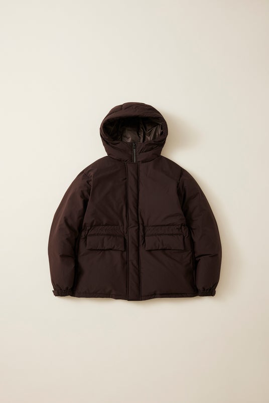 ミドル丈のフード付きダウンブルゾン。程よくゆとりのあるシルエットで、ウエスト部分のドローコードを絞ればシルエットのアレンジも可能。フロントは比翼仕立てでファスナーが見えないクリーンな表情に。両サイドからアクセスできるフラップ付きのフロントポケットもデザインのポイント。身頃裏には内ポケットも備えています。