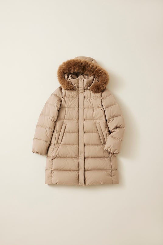 カジュアルにもきれいめにも合わせやすく着回し力抜群のロング丈ダウンコート。ボトムを選ばない着丈で着映えする一着に。ウエストをシェイプしたすっきりとしたシルエットながら、タイトすぎない絶妙なサイズ感もポイント。フードとフェイクファーはどちらも取り外し可能で、気分やシーンに合わせたアレンジが楽しめます。上下から開閉できるダブルジップ仕様で動きやすさとデザイン性を両立。オンにもオフにも活躍する一着です。