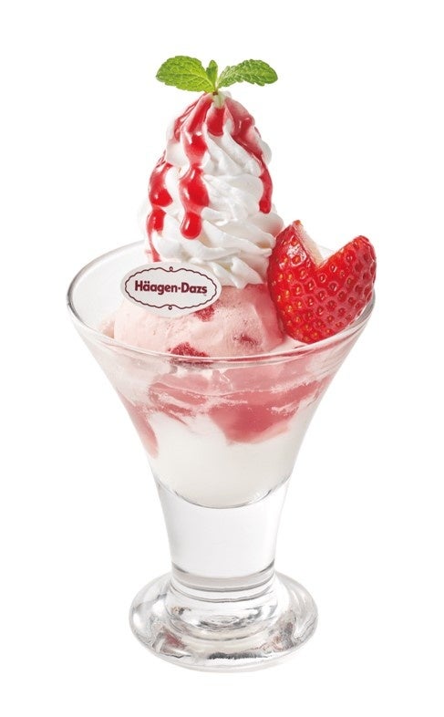 ハーゲンダッツ ストロベリーアイスクリーム、フレッシュいちご、ホイップクリーム、ラズベリーソース、コーンフレーク、スポンジケーキ、カスタードクリーム、ミックスベリー、いちごゼリー、アロエ