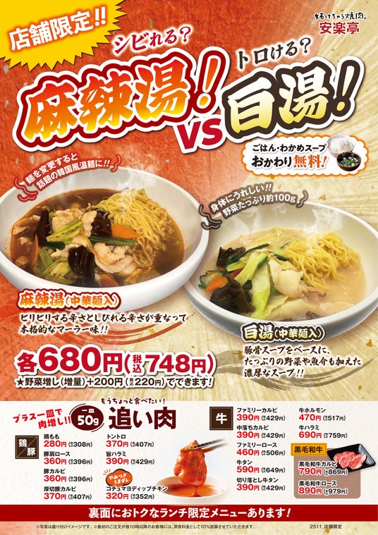 【安楽亭】本格麻辣湯・濃厚白湯を680円(税込748円)にて、5店舗限定で販売開始!ランチタイムには焼肉も付いてさらにお得な1,080円(1,188円)で販売!
