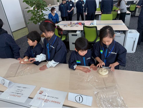まずは、薄力粉と強力粉の違いを簡単なクイズ形式で出題。それぞれの小麦粉をこねたり、伸ばしたり実際にさわりながら特徴を学びました。