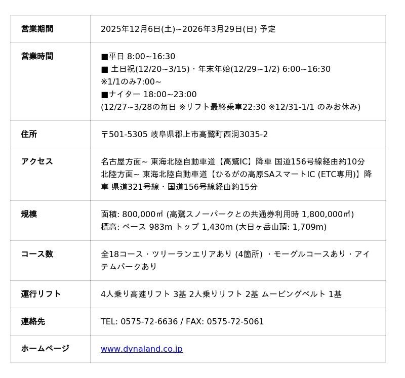 中部スノーアライアンス株式会社(〒501-5305 岐阜県郡上市高鷲町西洞3035-2 / 代表取締役:多賀真瑞)は岐阜県奥美濃のスキー場【ダイナランド】を2025年12月6日(土)より営業開始いたします。