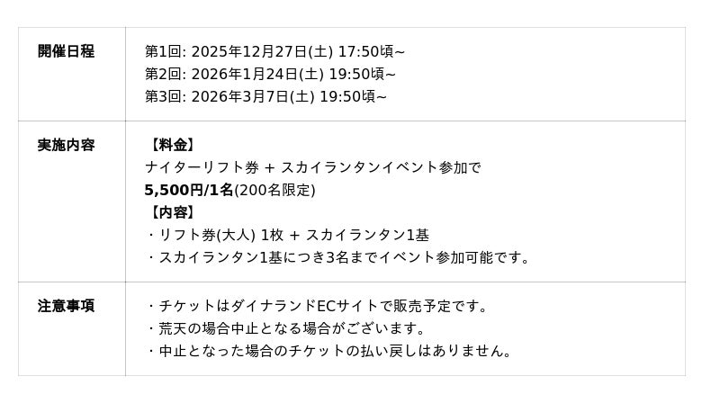 この「スノースカイランタン inダイナランド」の参加チケットは弊社が提供するWEBチケットサイト「LIPACA」を利用した販売を予定しており、200組限定の特別企画となります。チケットはダイナランドECサイトで販売予定です。 愛知・大阪からはイベントに合わせたナイターツアーのプランもご用意いたします。