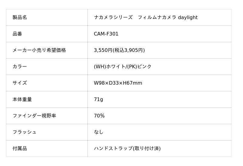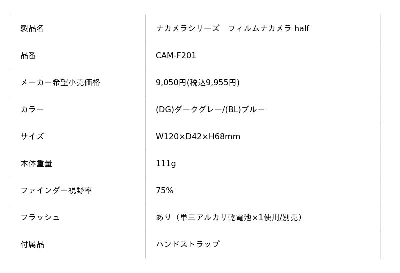 フィルムナカメラ、フィルムナカメラ halfに比べて小さく軽いので、持ち運びに便利です。