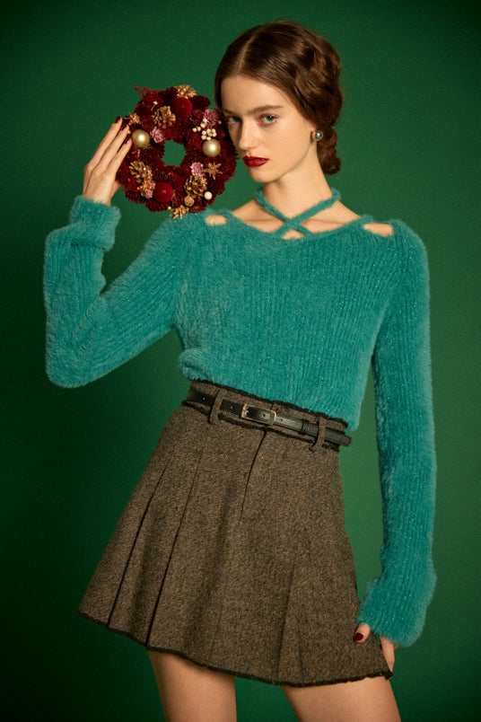 ラメ糸がきらめくミニシャギーニットや、ほどよい光沢がクリスマスムードを高めてくれるストリングベロアワンピース、大胆な柄が目を引くノルディッククロップドニットなど、全5LOOKをご紹介。