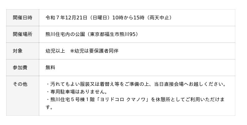 JKK東京(東京都住宅供給公社:東京都渋谷区、理事長:浜佳葉子、以下「JKK」)は、福生市のJKK住宅※「熊川住宅」内の公園で、子どもたちが自由に遊びを創造できる屋外遊び場「プレイパーク」を令和7年12月21日(日曜日)に初開催します。