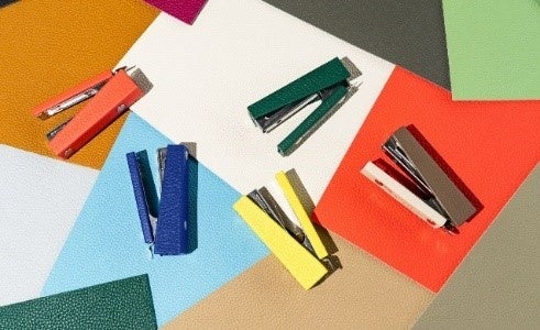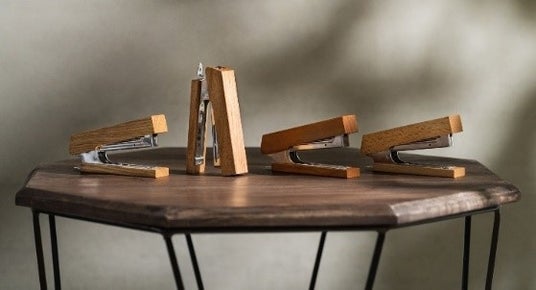本製品は、Maison Def(兵庫県豊岡市)、木と暮らしの制作所、kochi(岐阜県高山市)との共同企画です。カバンや家具制作の過程で出る端材をアップサイクルし、職人の熟練の技術により、手作業で完成させています。革のホッチキスは5色、木のホッチキスは4樹種で展開しています。