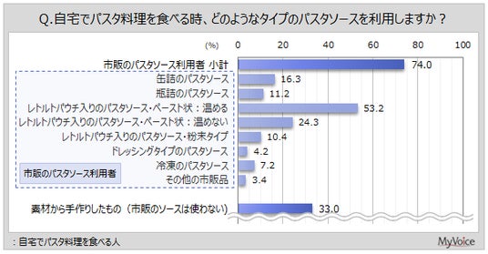 自宅でパスタを食べる人のうち、市販のパスタソースを利用する人は74%です。