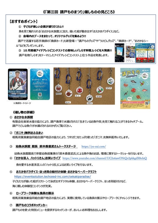当日は子供が楽しめる体感型企画が盛りだくさん!! その他、会場を回ってゲットするオリジナルグッズのプレゼント企画や、美味しいガニ汁無料配布、請戸ものコラボキッチンカー、お笑いライブやトークショー等もご用意しています。10月に実施したアイディアレシピコンテスト(請戸名物「しらす」がテーマ)の上位5作品も大発表!!