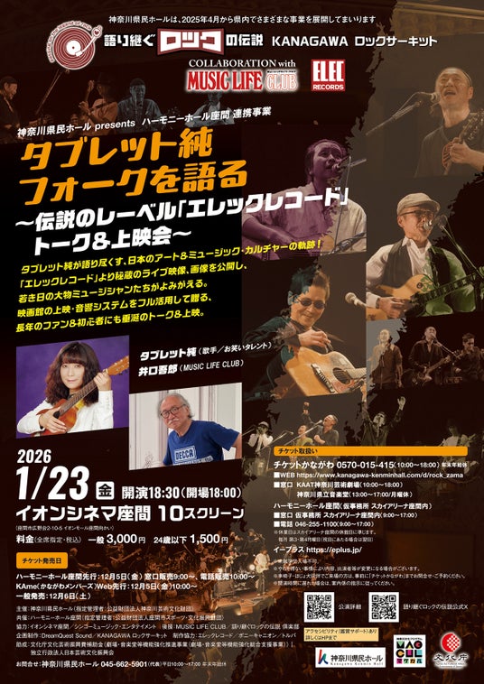 「KANAGAWA ロックサーキット」第3弾はイオンシネマ座間にて開催します。出演は、日本の音楽史に大きな足跡を残したムード歌謡バンド「和田弘とマヒナスターズ」最後のヴォーカリストとしてデビューし、解散後はネオ昭和歌謡を歌うソロ歌手、ムード歌謡漫談&物まね芸人として大活躍中のタブレット純。そしてシンコーミュージック【MUSIC LIFE CLUB】メディアプロモーション担当で元「BACK STAGE PASS」編集長の井口吾郎を迎え、70年代にフォーク音楽の大ブームを巻き起こした伝説のインディーズレーベル「エレックレコード」に注目し、その魅力を大解剖します!