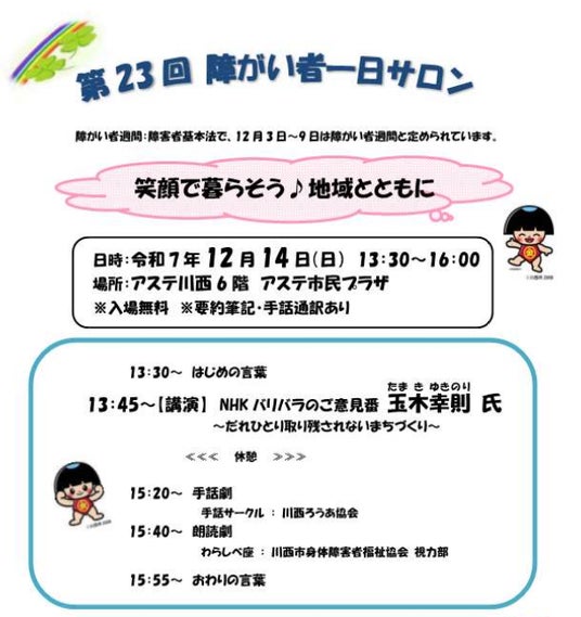 当日は、会場のアステホールで「だれひとり取り残されないまちづくり」をテーマに玉木幸則氏の講演や、川西ろうあ協会による手話劇、川西市身体障害者福祉協会視力部「わらしべ座」による朗読が行われます。