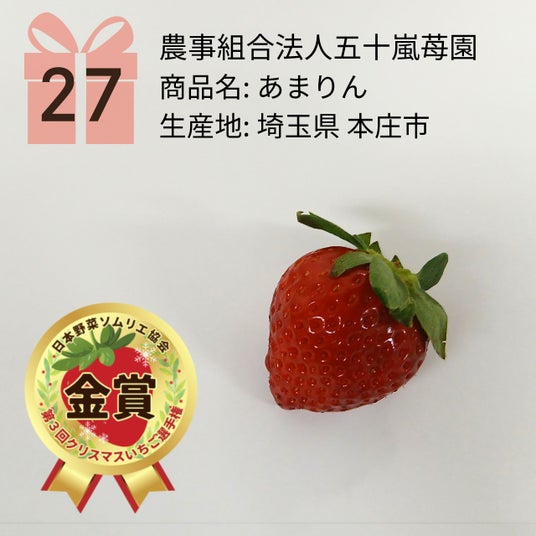 そのおいしさを審査し、評価員全員の合計点数によって各賞を決定しました。審査の結果、「第3回クリスマスいちご選手権」の最高金賞には、埼玉県本庄市の『べにたま -X-』(久米原農園 8代目 美幸)が輝きました。埼玉県産のいちごが3年連続で最高金賞を受賞する中、栃木県産とちあいか、茨城県産いばらキッス、奈良県産ならあかり、石川県産ベリーポップすずが上位に選ばれました。