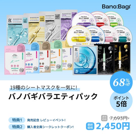 さらに、Qoo10で発売した後に総合ランキング1位を達成して大好評を博した「バラエティパック」を、楽天でも販売します。バノバギの様々なマスクパックを一度に体験したいという消費者の方々の声援に支えられ発売することになった「バラエティパック」は、「ビタジェニックゼリーマスク」7種をはじめ、複合ケア成分を配合し特別な日のケアに良い「プレミアムインジェクションマスク」2種、シートマスクとスリーピングマスクを同時に楽しめる2in1「DXマスク」5種、肌のコンディションに合わせてお使いいただける「スキンブースターマスク」4種、高機能アンチエイジングケアが可能な「PDRNコラーゲンゲルマスク」まで計19種類で構成されており、スーパーSALE期間中には最大68%OFFでお買い求めいただけます。