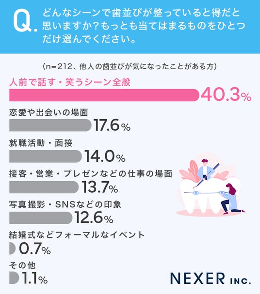 歯並びは笑顔の印象を大きく左右し、「人前で話す場面」「仕事」「恋愛」など幅広いシーンで評価に影響することも明らかになりました。