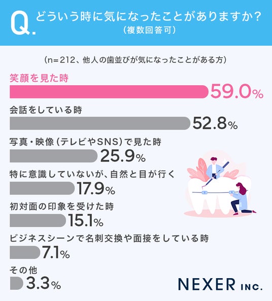 他人の歯並びが気になる場面として最も多かったのは「笑顔を見たとき」で、続いて「会話をしている時」が半数を超えました。