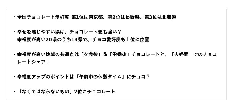 今回の調査で、幸福度ランキング上位20都道府県のうち、13都道府県が「愛好度ランキング」でもトップ20にランクインしていることがわかりました。明確な因果関係を示すものではありませんが、チョコレート愛好度と、幸福度に一定の関係性がある可能性があります。