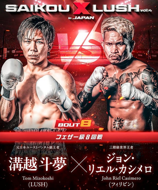 「SAIKO × LUSH vol.4 in JAPAN」第8試合といたしまして、フェザー級8回戦 ジョン・リエル・カシメロ(36=フィリピン) vs 溝越 斗夢(26=LUSH)のカードが決定いたしました。