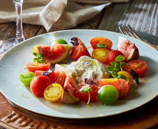 右:イタリア産ブラータチーズと季節のフルーツ、カラフルトマトのカプレーゼ 2,080円