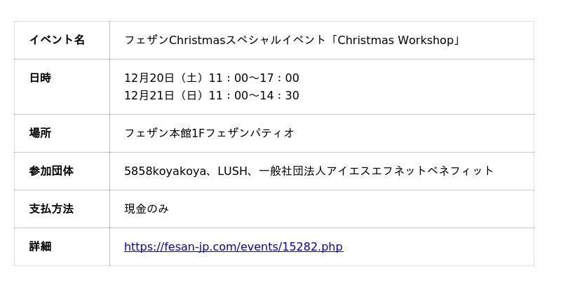 一般社団法人アイエスエフネットベネフィット(拠点:東京都港区、代表理事:渡邉幸義、以下アイエスエフネットベネフィット)盛岡事業所は、2025年12月20日、21日の2日間に盛岡駅ビルフェザン本館1Fフェザンパティオにて開催される「Christmas Workshop(クリスマス ワークショップ)」に出展することをお知らせいたします。