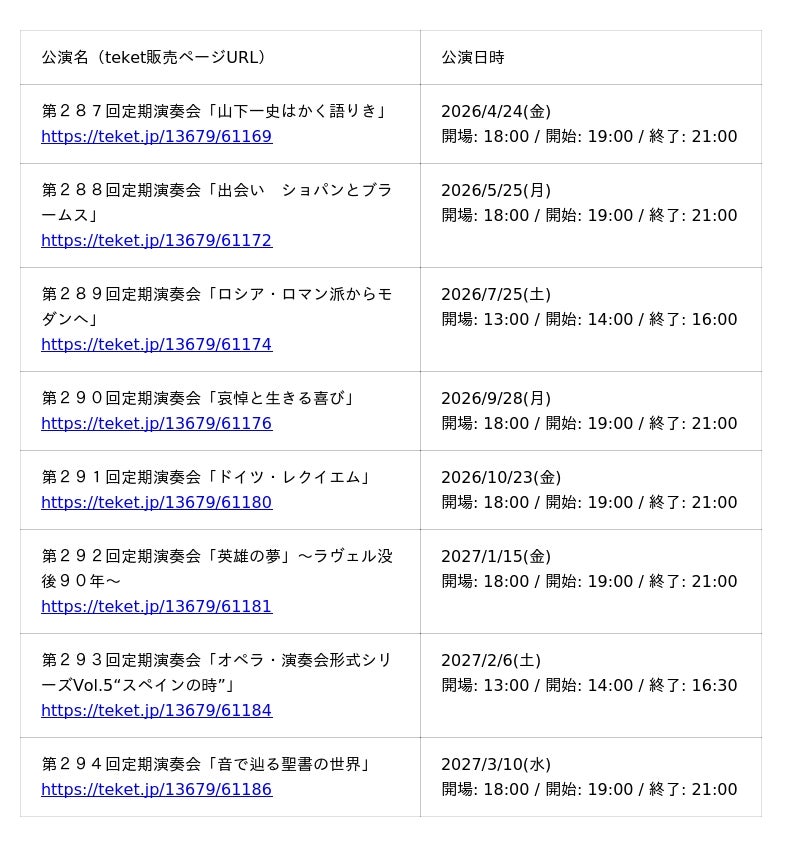電子チケット販売・管理サービスteket(テケト)の企画開発をする株式会社teket(本社:東京都中央区、代表取締役社長:島村 奨)は、この度、公益社団法人 大阪交響楽団(所在地:大阪府堺市、理事長:芳井敬一)の 2026年度定期演奏会 のチケットを、teketにて独占で先行販売することをお知らせいたします。