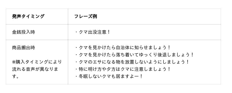 本取り組みは、市街地に出没するクマへの注意喚起を目的に、自動販売機を通じて住民の安全確保に寄与することをめざして企画したものです。本自販機には、金銭投入時に「クマ出没注意!」、商品搬出時には「クマを見かけたら落ち着いてゆっくり後退しましょう!」などのオリジナルメッセージが流れる機能を搭載しております。また、紫波町公式LINEの登録用QRコード※を掲示し、クマ出没情報の確認を促進することで、クマ対策への意識向上につながることを期待しております。