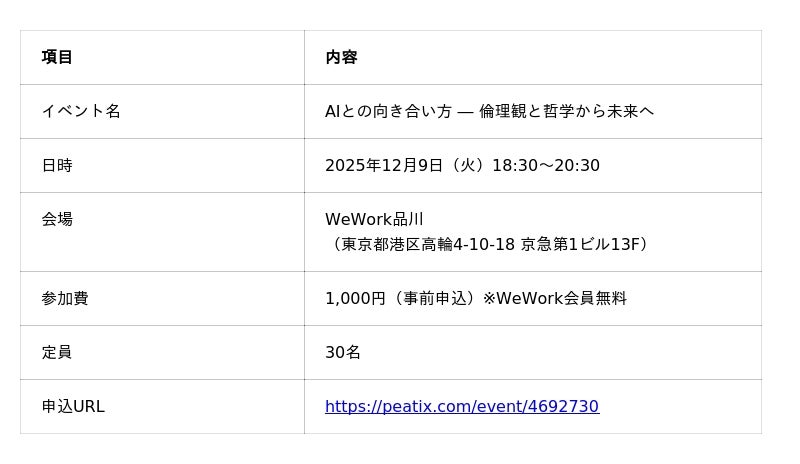 伊東雄歩が理事を務める健全AI教育協会は、次世代AI教育株式会社と共同主催で、AI時代における倫理観・哲学・教育をテーマにした特別講演「AIとの向き合い方 ― 倫理観と哲学から未来へ」を2025年12月9日(火) 東京WeWork麻布十番にて開催します。