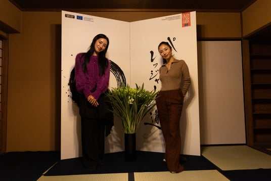 パルミジャーノ・レッジャーノ道の屏風前、ゲストの映画プロデューサー MEGUMI さん(右)と女優 中田くるみさん(左)