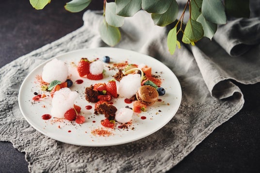 旬のフルーツなどを使い、冬を表現した一⽫。ガトーショコラをメインに国産苺、チョコレートマカロン、苺ブラウニーベリーソース、ブルーベリー、フランボワーズ、泡ソース、ベリーパウダー、ローズ、ミント、カールチョコレートなどを使用
