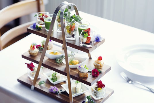 ⾊鮮やかな「Herb Garden」をイメージした前菜を3段の専用スタンドに並べ、お席までお持ちいたします。メイン料理(肉料理、⿂料理、パスタ)は、9種からお好きな一⽫をお選びいただけます