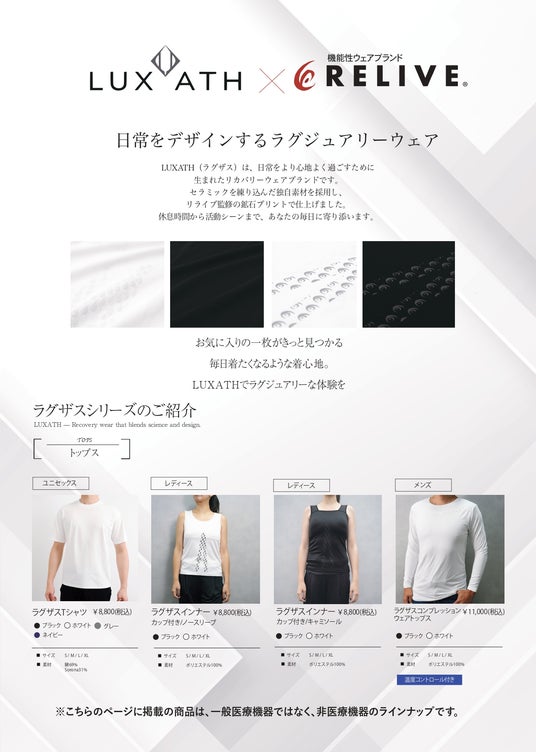 株式会社ユアーショップ(本社:兵庫県尼崎市、代表取締役:西村直也)は、株式会社りらいぶが提供する「リライブ加工」技術を採用した一般医療機器シリーズ「LUXATH(ラグザス)」を、2025年12月中旬より順次発売いたします。