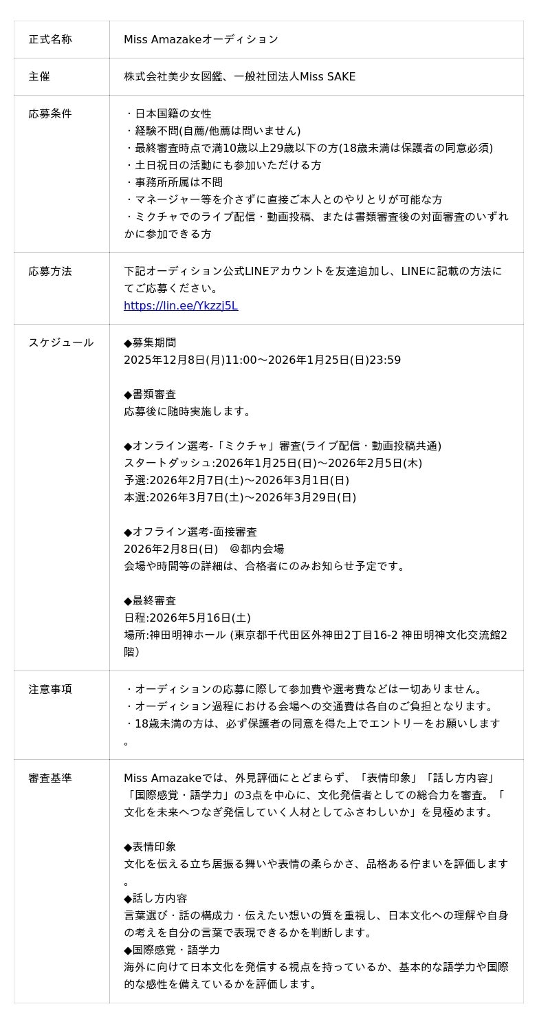 『2026 Miss Amazake』募集開始!日本の伝統“甘酒”の魅力を国内外へ発信する「未来の日本を担うアンバサダー」を発掘します - 二階堂ふみらを輩出した美少女図鑑との共同プロジェクト