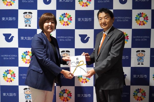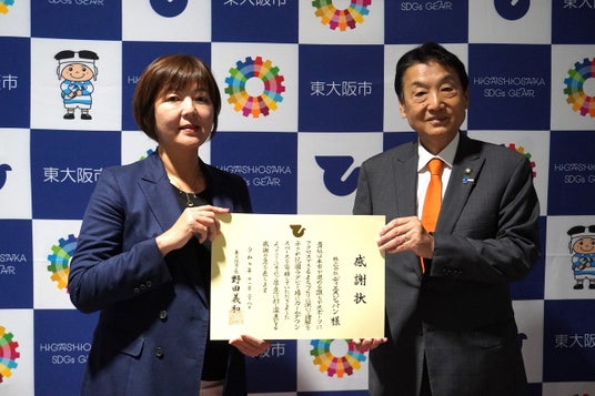 写真左:株式会社ディエスジャパン 代表取締役 北條 陽子 写真右:東大阪市長 野田 義和 様