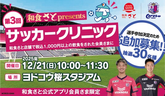 国内200店舗を展開する「和食さと」では、「和食さとpresentsサッカークリニック」を、2025年12月21日(日)にヨドコウ桜スタジアムで開催します。このたびのサッカークリニックについて、本年特別に2名の選手が参加となること緊急決定しました!!